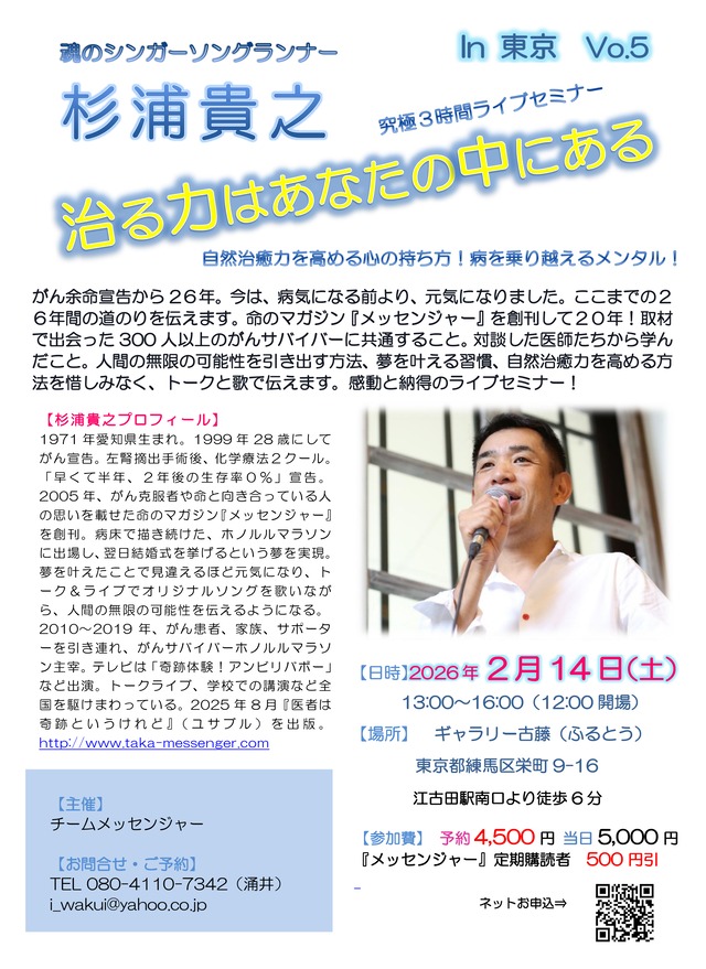 【一般】お申込み窓口です。 2月14日(土)杉浦貴之・究極3時間ビンビンセミナー in 東京 Vol.5 全国で大好評の濃密な3時間講座、7年ぶりの開催です。 トーク中心で、通常のトーク&ライブでは伝えきれないことを伝えます!歌も少々あり。 受講後、各地で変化の声を続々いただいています。 「夢が叶った」「調子がすこぶるいい!」「この日が私のターニングポイントだった」 そんな声をたくさんいただいています。 治癒力を高める心の持ち方!病を乗り越えるメンタル! がん余命宣告から26年。今は、病気になる前より、元気になりました。 ここまでの26年間の道のりを伝えます。 命のマガジン『メッセンジャー』を創刊して26年! 取材で出会った300人以上のがんサバイバーに共通すること。 対談した医師たちから学んだことは? 不安や恐怖に襲われたとき、いかに心を整えるか。 人間の無限の可能性をいかに引き出すか。 自身の経験から惜しみなく、トークと歌で伝えます。 感動と納得のライブセミナー! 少人数制で参加された皆さんと濃くつながることができます。 ビビッと感じた方、今の自分に必要と感じた方、どなたでもご参加いただけます。 参加者その後① 「あふれる生命力を生きる喜びに向けて!」 ⇒ https://ameblo.jp/lifeisstrong/entry-12438544103.html 参加者その後② 『杉浦貴之さんの3時間ビンビンセミナーで夢を語ってきました!』 ⇒ https://ameblo.jp/ocean-gem/entry-12442468327.html ☆会場☆ ギャラリー古藤(ふるとう) 東京都練馬区栄町9-16 http://furuto.art.coocan.jp/ ※江古田駅南口徒歩6分 ※千川通り沿い・武蔵大学正門斜め前 さらに詳しいアクセス↓ http://furuto.art.coocan.jp/akusesnewpage5.html ☆料金☆ 【一般】4,500円 【『メッセンジャー』定期購読者】 4,000円 『メッセンジャー』とは? https://www.taka-messenger.com/category/messenger ☆主催☆ チームメッセンジャー ☆お申込み☆ https://takamessenge.thebase.in/ ※決済がうまくいかない場合、最後の「PAY ID」のチェックを外すとできるときがあります。 ☆お問合せ☆ TEL 080-4110-7342(涌井) Mail : [email protected] (涌井) ○杉浦貴之○ 1971年愛知県生まれ。1999年28歳にしてがん宣告。「早くて半年、2年後の生存率0%」と言われる。左腎摘出手術、化学療法後、再発予防を目的に様々な養生法に取り組む。呼吸法をきっかけに、発声により体の回復を実感し、歌うことへ繋がっていく。2005年、がん克服者や命と向き合っている人の思いを載せた命のマガジン『メッセンジャー』創刊。病床で描き続けた夢を叶えたことで見違えるほど元気になり、トーク&ライブでオリジナルソングを歌いながら、人間の無限の可能性を伝えるようになる。2010~2019年がんサバイバーホノルルマラソンツアーを主宰。「誰も知らない泣ける歌」「奇跡体験!アンビリバボー」など出演。トークライブ、学校での講演、『メッセンジャー』の取材と全国を駆けまわっている。2025年8月『医者は奇跡というけれど』(ユサブル)を出版。http://www.taka-messenger.com/ 終了後、5日以内に領収書をクリックポストにて送付させていただきます。
