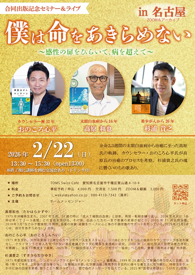 【ZOOM&アーカイブ】のお申込みです 【会場&ZOOM&アーカイブ】 2月22日(日)髙原和也&おのころ心平&杉浦貴之・合同出版記念セミナー in 名古屋 『僕は命をあきらめない』 ~感性の扉をひらいて、病を超えて〜 ZOOM&アーカイブ配信あり! 髙原和也氏は31歳で悪性度の高い「成人T細胞白血病」を発症。 再発・転移を繰り返し、最後、余命は「早ければ2~3週間」との宣告を受ける。 そこから、ある人にかけられた言葉で深い気づきを得て、V字回復。 万策尽きた状況から、完全寛解をもたらした意識の変容とは? 2025年11月『ぼくは、自分をあきらめない』出版! https://amzn.to/48SSwaC おのころ心平氏は、ココロとカラダをつなぐ独自のカウンセリング手法を確立し、クライアントご本人も気づかない潜在意識とカラダの関係を実践的に研究。 カウンセリング実績3万件以上、いかにクライアントの感性を引き出し、病からの回復に貢献してきたか? 今回は髙原氏の治癒のプロセスを考察。 2025年12月『感情はがしマッサージ』(経営科学出版)出版! https://personalhealth.jp/lp/OEM/CPO_OEM_990_ONO_0M_OCK.php 杉浦貴之氏は、当時「早くて半年、2年後生存率0%」の希少がんから26年経過。 様々な養生法に取り組み、悩み迷いながら感性を磨き、歌うことで内側から生きる力を取り戻し、がんを乗り越えてきた。 希望、勇気、生きる力湧き出る、トークと歌を披露。 2025年8月『医者は奇跡というけれど』(ユサブル)出版! https://www.taka-messenger.com/diary/kisekino.html 3人のクロストーク、 Liveと盛りだくさんの2時間! ※この日はセミナー終了後、3人の講師を囲む交流会を開催。 ※ZOOMで同時中継あり!アーカイブ配信もあり! ☆日時☆ 2月22日(日) 13:30~15:30(open 13:00) ※終了後に3人を囲む交流会あり! ☆会場☆ TOMS Swiss Cafe 名古屋市千種区東山通4-10-4(地下鉄東山公園駅すぐ) https://toms.nagoya/ ☆料金☆ 事前予約/申込 4,000円 交流会 1,500円(ドリンク付) 【ZOOM&アーカイブ視聴】 3,000円 ※ZOOM参加者にもアーカイブを送ります。当日都合の悪い方はアーカイブをご覧ください。アーカイブは、イベント終了後、1週間以内にメールアドレスに、スマホでも視聴可能な動画配信サイトのURLを送らせていただきます。 ☆主催☆ チームメッセンジャー ☆お申込み☆ https://takamessenge.thebase.in/ ※決済がうまくいかない場合、最後の「PAY ID」のチェックを外すとできるときがあります。 ☆お問合せ☆ Mail : [email protected] TEL 080-4110-7342(涌井) ○髙原和也○ 1975年沖縄県生まれ。2007年3月、31歳の時に転勤先の石垣島で沖縄県職員として勤務していたところ、リンパの腫れや微熱が続き検査したところ「成人T細胞白血病」と診断される。同年12月、骨髄移植。一時寛解したものの移植から10か月後(2008年10月)に再発。放射線治療を受け再寛解。2009年4月職場復帰したが、2か月後に腓骨の病的骨折で再々発し、全身転移。同年8月「早くて2~3週間。今のうちに会いたい人に会ってきて下さい」と余命宣告を受け退院。その後、様々な代替療法で希望をつなぎ延命していた中出会った方の一言で意識の変容が起こる。その後、一進一退を繰り返しながら2010年11月自然治癒(自己治癒)。杉浦貴之主宰のがんサバイバーホノルルマラソンに参加。2019年3月沖縄県庁を退職し、「Awakening Support サロン なごみや」を開院。自身の体験・経験をベースに心と体の不調改善のサポートを行っている。杉浦貴之編著『がんステージⅣ克服』に登場している。2025年11月『ぼくは、自分をあきらめない』出版。https://7538-seitai.com/ ○おのころ心平○ 1971年生まれ。大学卒業後22歳からカウンセラー人生をスタート。ココロとカラダをつなぐ独自のカウンセリング手法を確立し、クライアントご本人も気づかない潜在意識とカラダの関係を実践的に研究。2008年「一般社団法人自然治癒力学校」を開講し、全国13教室まで展開。2023年、「一般社団法人マッピングセラピー協会」へと改称。自然治癒力の発動は、自分を取り戻せる空間・時間のリトリート、そして「身近な家庭環境や職場環境から」をモットーに、アイビーマッピングによる傾聴技術の普及を通じて「健康なコミュニケーション空間」の創造をプロデュースしている。著書に、『病気は才能』(かんき出版)、『ゆるすいっち』(主婦の友社)、『最強のココロ整理術ibマッピング』(マガジンハウス)、『ココロとカラダ 元気のしくみ』(さくら舎)『人生がうまくいく!セラピスト。という生き方』『ななつのスイッチ』『怒るカラダ』『感情はがしマッサージ』(経営科学出版)など多数。https://ameblo.jp/onocoroshinpei/ ○杉浦貴之○ 1971年愛知県生まれ。1999年28歳にして腎臓の希少がん宣告。「早くて半年、2年後の生存率0%」と言われる。左腎摘出手術、化学療法後、再発予防を目的に様々な養生法に取り組む。呼吸法をきっかけに、発声により体の回復を実感し、歌うことへ繋がっていく。2005年、がん克服者や命と向き合っている人の思いを載せた命のマガジン『メッセンジャー』創刊。病床で描き続けた夢を叶